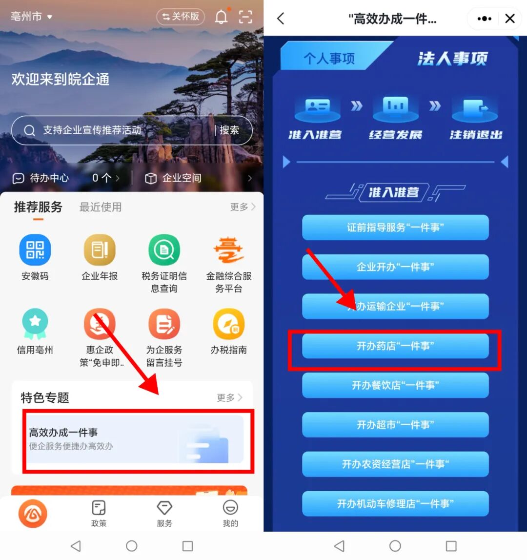 2、左上角城市选择“亳州市”,在首页“特色专题”下点击“高效办成一件事”,在法人事项中找到“开办药店一件事”,点击进入。