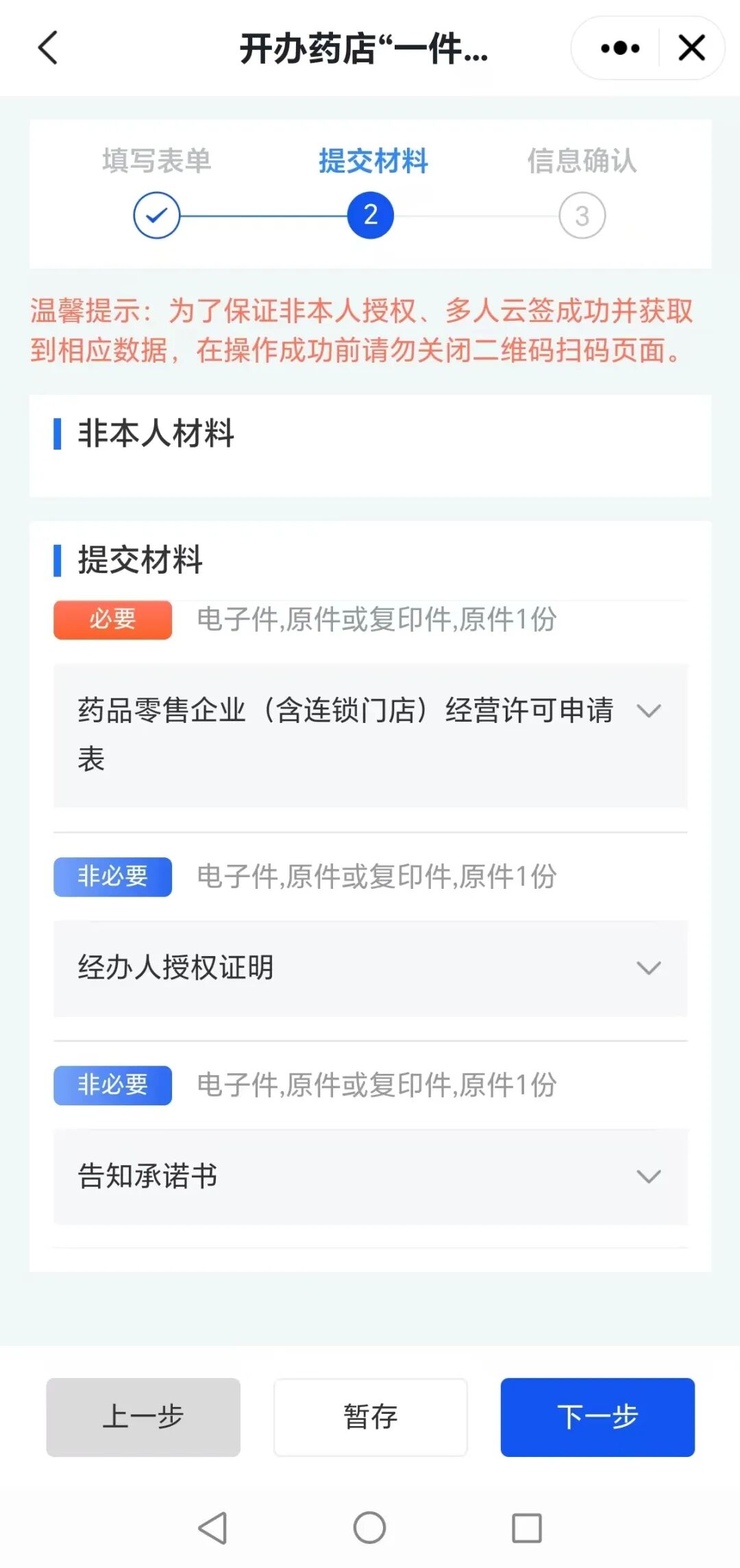 7、根据提示信息上传对应材料。对材料信息进行检查无误后,点击【下一步】按钮进入信息确认页面。
