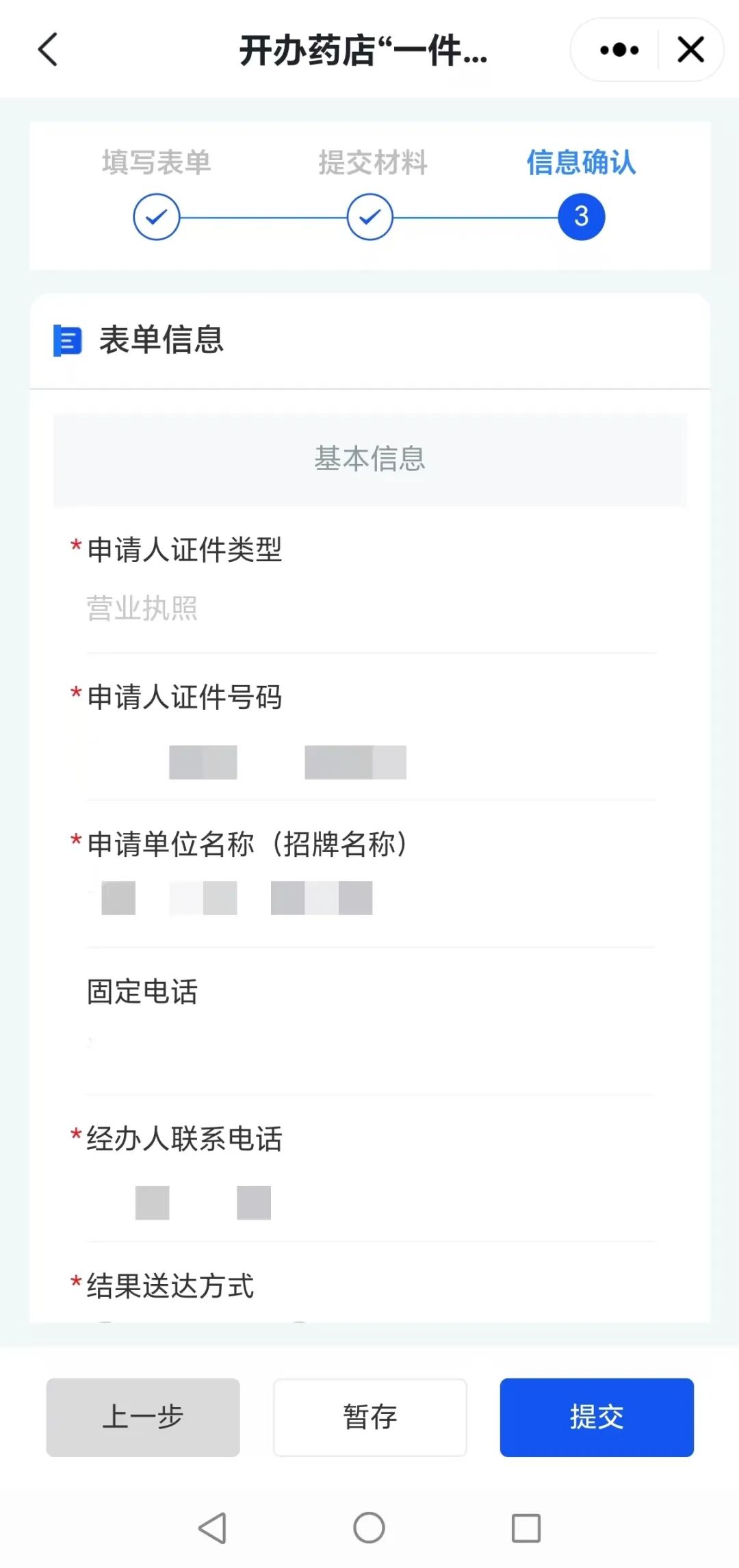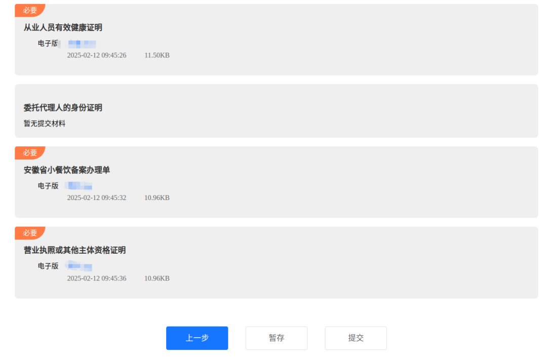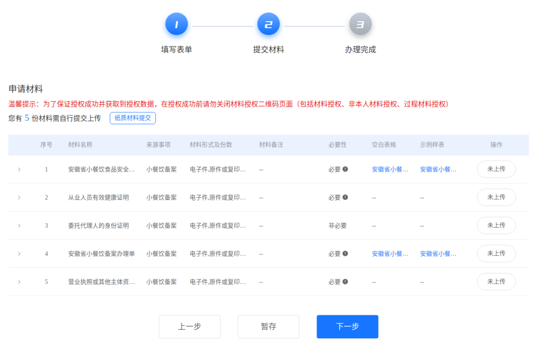 5、根据页面提示信息上传对应的材料,材料上传完成后点击【下一步】按钮,进入到信息确认页面。