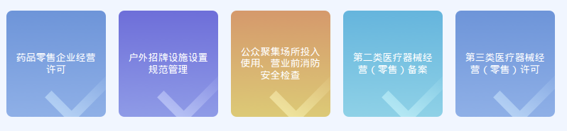 已取得营业执照的经营主体,可根据经营需要,同步申请药品零售企业经营许可,第二类医疗器械经营(零售)备案,第三类医疗器械经营(零售)许可,户外招牌设施设置规范管理,公众聚集场所投入使用、营业前消防安全检查政务服务事项。