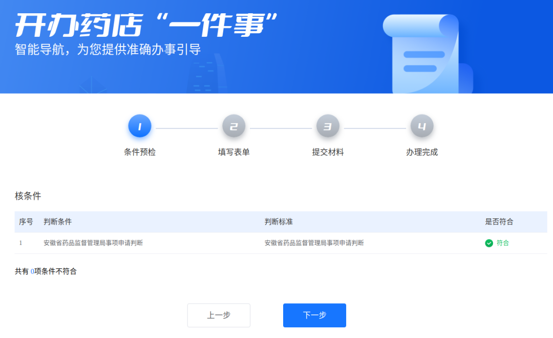 3、进入“条件预检”页面,系统自动对申请企业是否属于核查对象进行预检,不符合办理条件的,则无法继续办理;符合条件的企业,点击【下一步】按钮,进入填写表单页面。