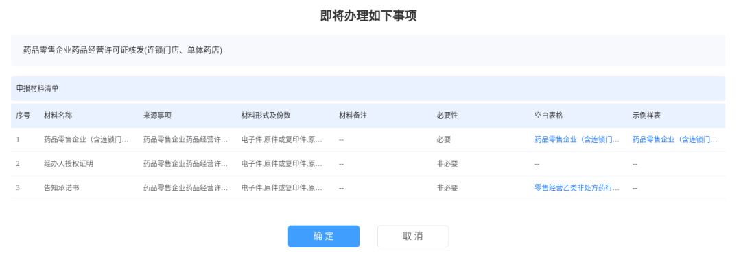 2、申请人阅读“用户须知”内容后点击【进入办事】按钮,根据实际办理需求选择对应的选项,点击【确认】按钮,进入事项、材料确认页面。