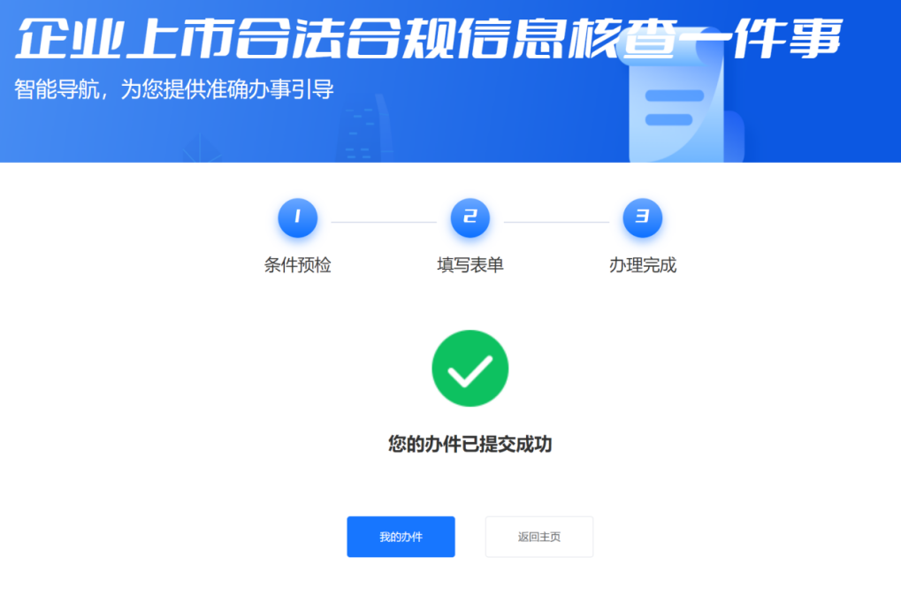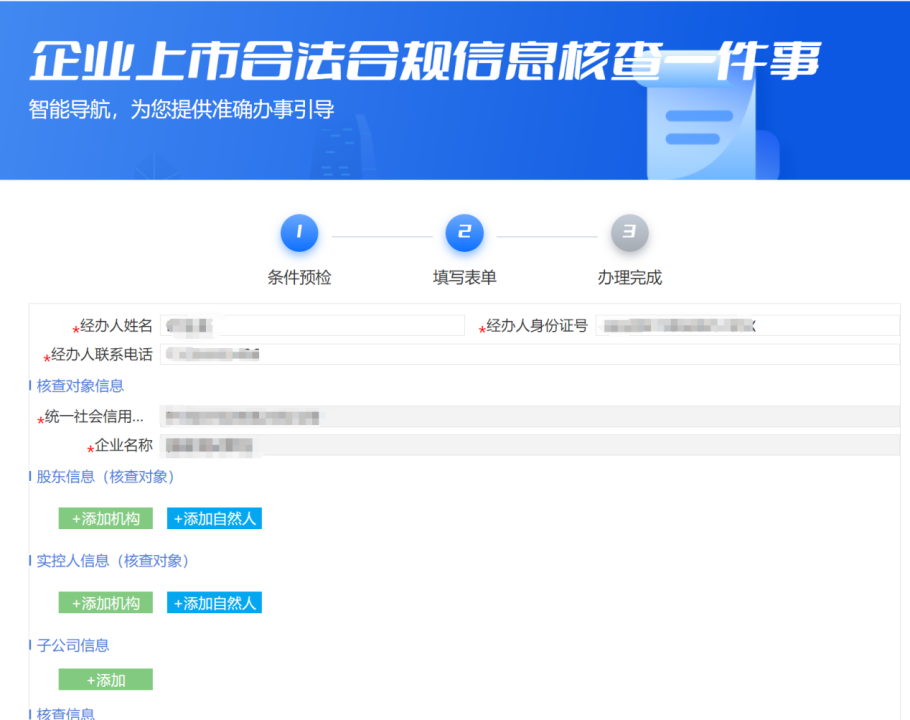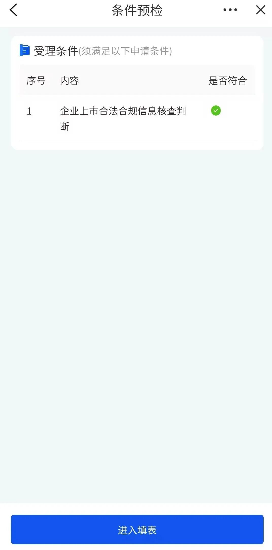 4、点击【确定】按钮进入“条件预检”页面,系统自动对申请企业是否属于核查对象进行预检,不符合办理条件的,则无法继续办理;符合条件的企业,点击【进入填表】按钮,进入填写表单页面。