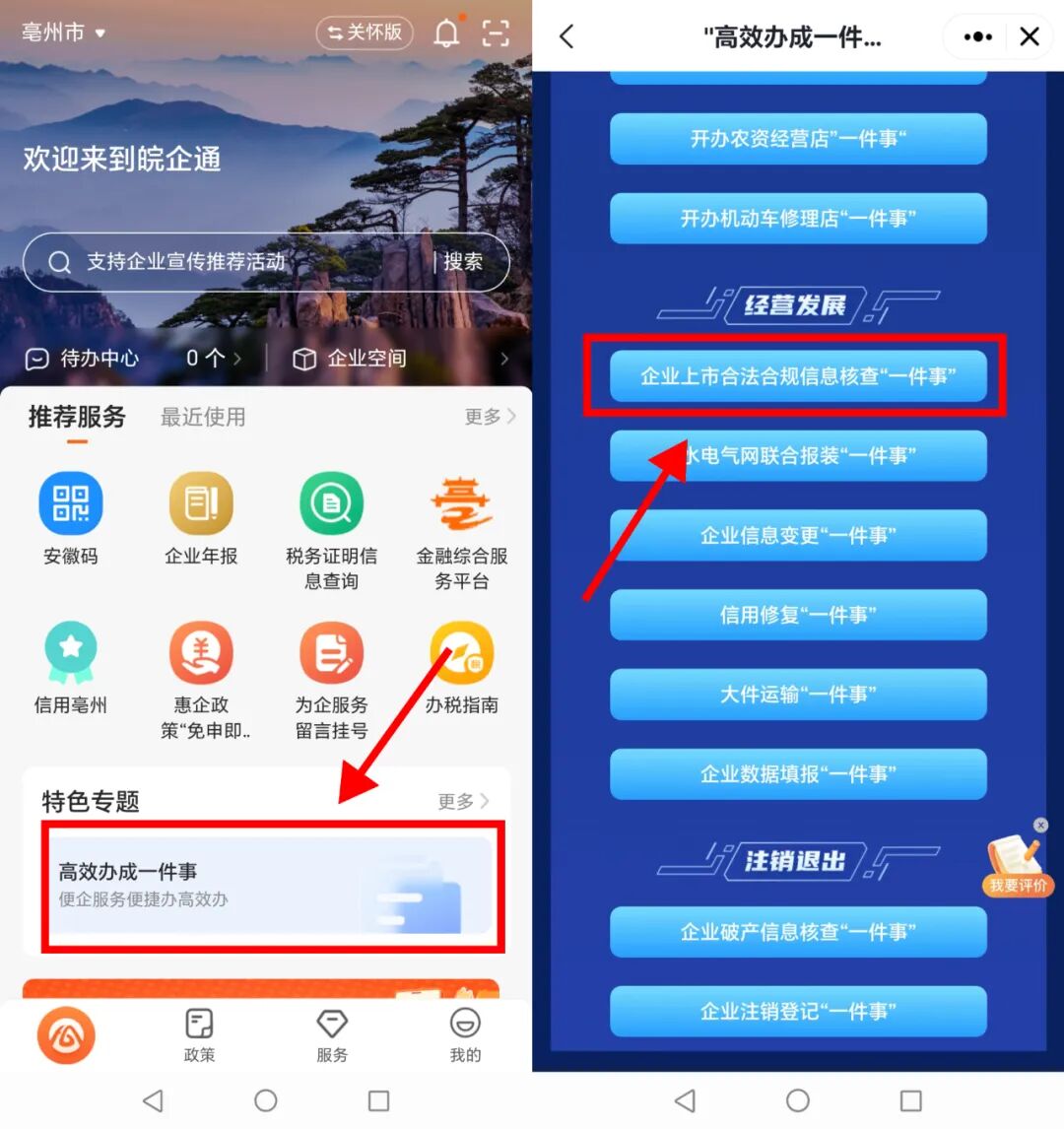 2、左上角城市选择“亳州市”,在首页“特色专题”下点击“高效办成一件事”,在法人事项中找到“企业上市合法合规信息核查一件事”,点击进入。