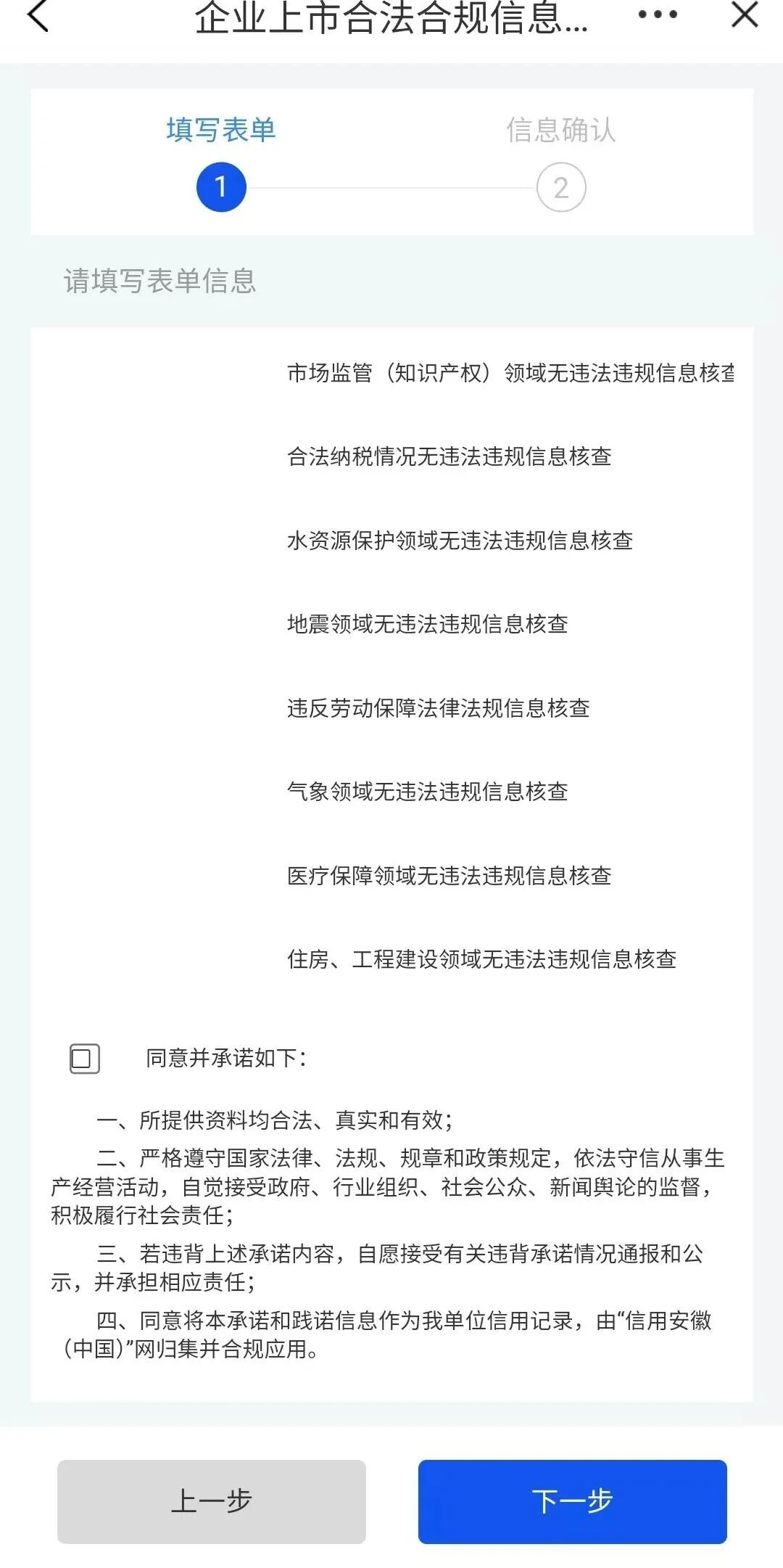 5、根据页面提示补充填写企业相关的信息,勾选“同意承诺书”后点击【下一步】按钮进入信息确认页面。