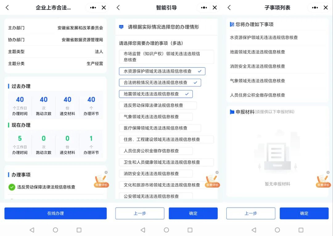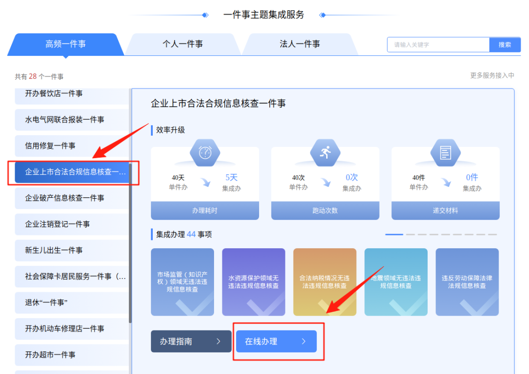 1、使用法人账号登录安徽政务服务网亳州分厅,点击“高效办成一件事”,搜索“企业上市合法合规信息核查一件事”,点击“在线办理”。