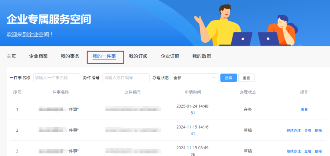 7、已提交的办件可在“企业空间-我的一件事”中查看办件进度状态。