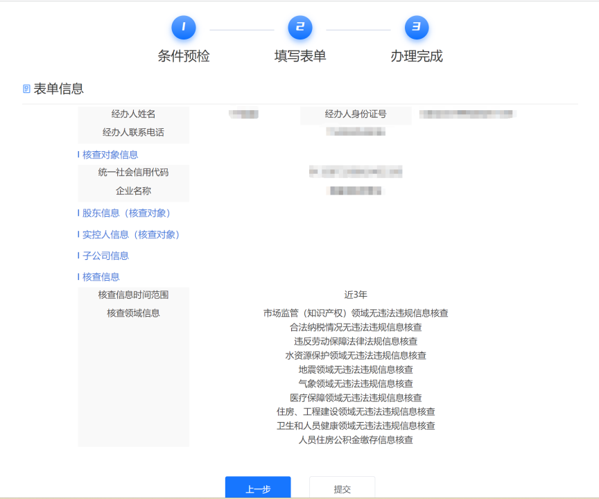 5、对核查信息进行检查无误后,点击最下方的【提交】按钮进行办件提交。