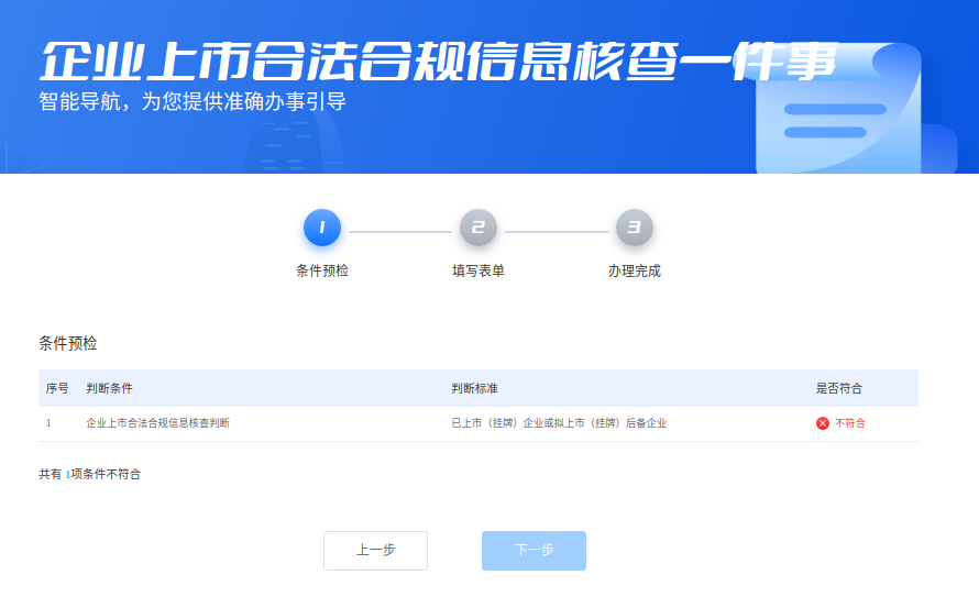 3、进入“条件预检”页面,系统自动对申请企业是否属于核查对象进行预检,不符合办理条件的,则无法继续办理;符合条件的企业,点击【下一步】按钮,进入填写表单页面。