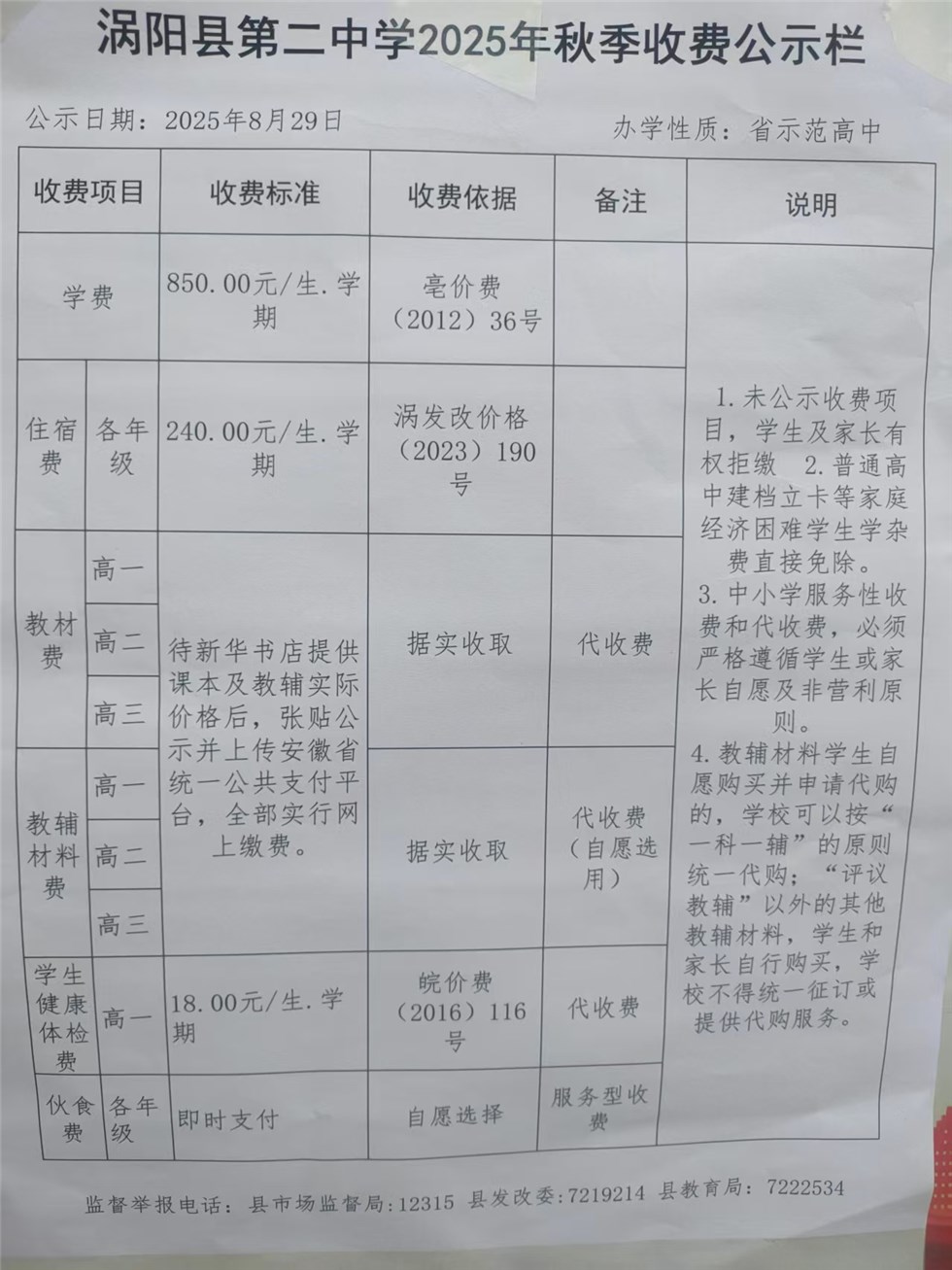 涡阳县第二中学2025秋季收费公示