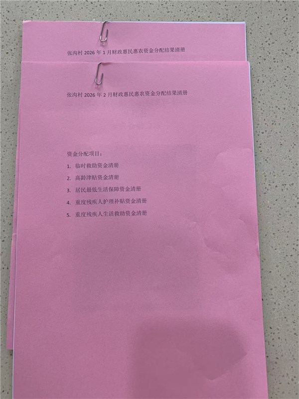 西阳镇张沟村2026年1-2月份财政惠民惠农补贴公示、资料留存情况