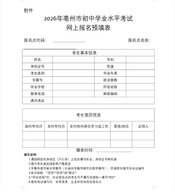 4.报名时须填写《亳州市2026年初中学业水平考试网上报名预填表》(见附件1)。