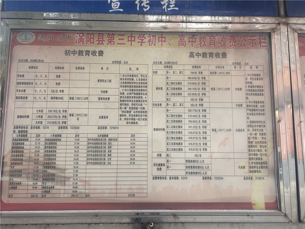 涡阳三中2026年春季收费标准