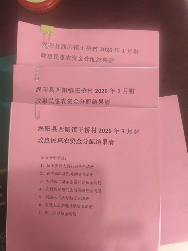 西阳镇王桥村2026年1-3月份财政惠民惠农补贴公示、资料留存情况