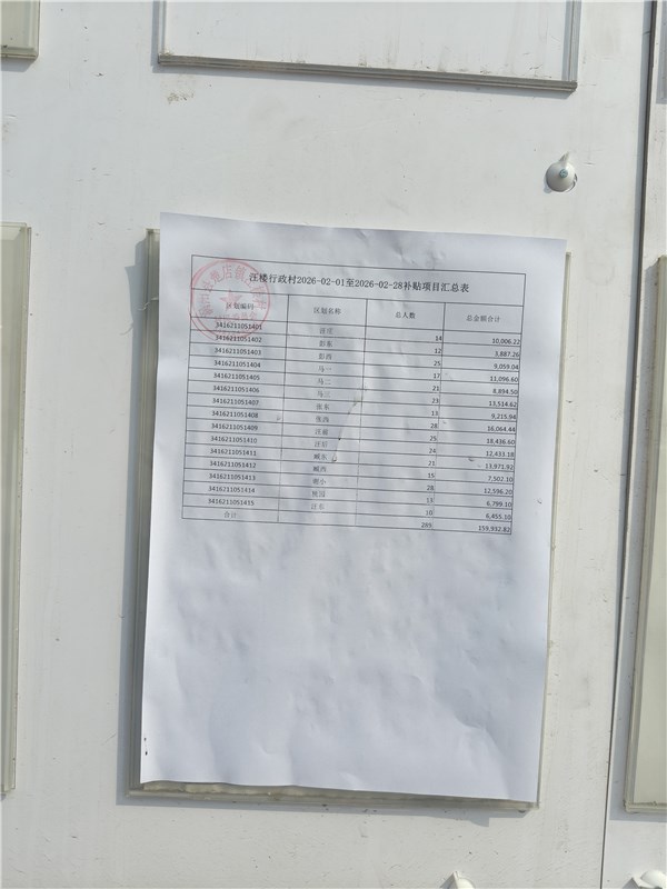 涡阳县楚店镇汪楼村2026年2月份财政惠民惠农补贴公示、资料留存