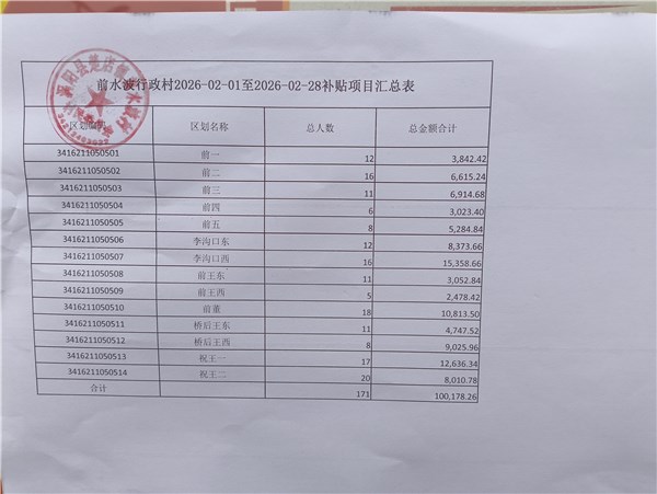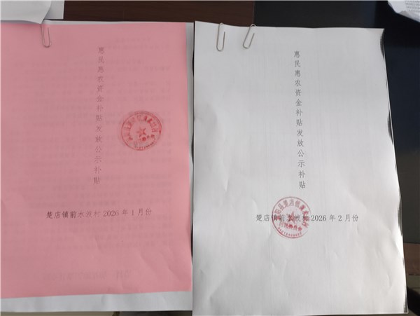 涡阳县楚店镇前水波村2026年2月份财政惠民惠农补贴公示、资料留存