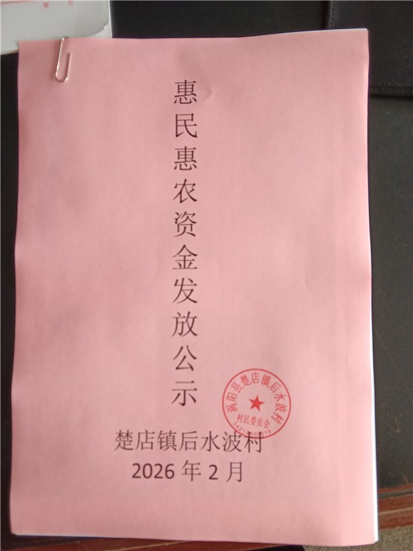 涡阳县楚店镇后水波村2026年2月份财政惠民惠农补贴公示、资料留存