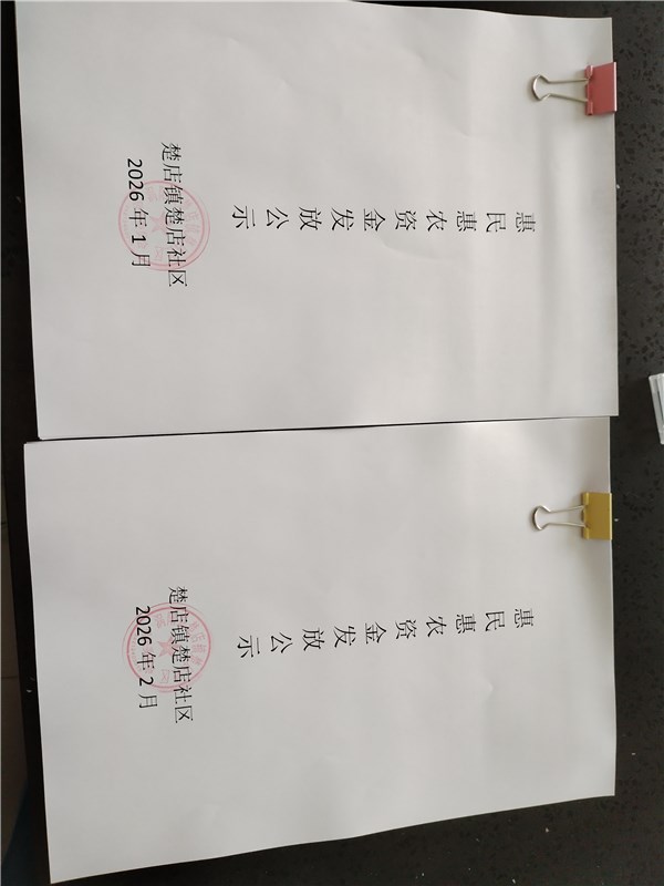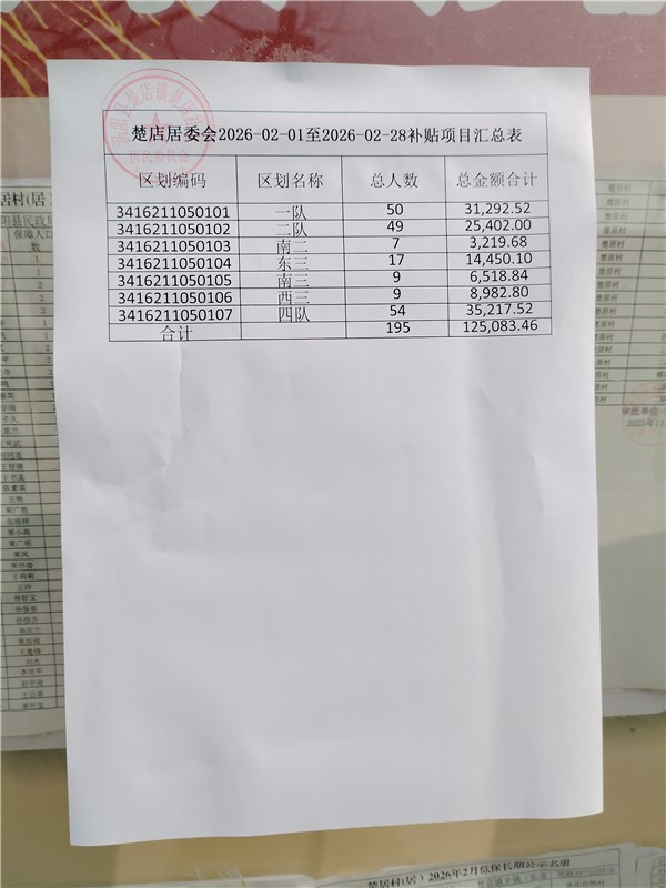 涡阳县楚店镇楚店社区2026年2月份财政惠民惠农补贴公示、资料留存