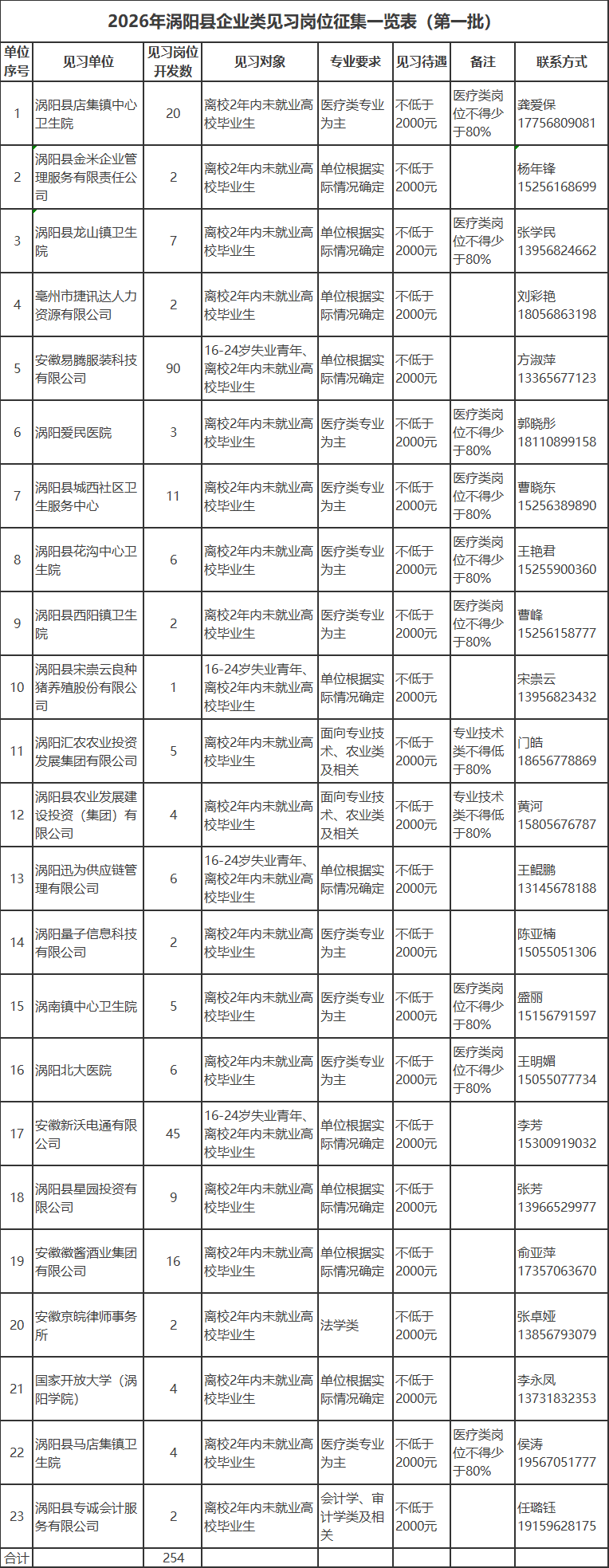 附件:《2026年涡阳县企业类见习岗位征集一览表(第一批)》