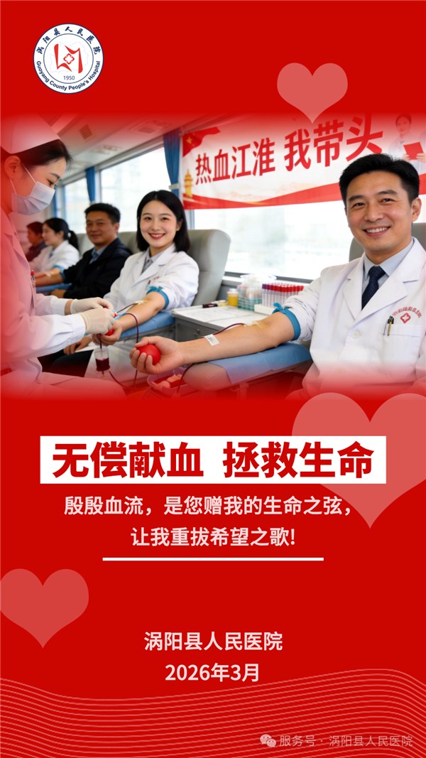 为保障全市临床用血供应,响应市卫生健康委号召,我院于2026年3月23日至27日在新门诊南门广场组织开展“热血江淮 我带头”春季无偿献血活动。活动得到全院干部职工积极响应,共有近170名同志成功参与,累计献血量超过50000毫升,用实际行动诠释了医务工作者的社会责任与担当。