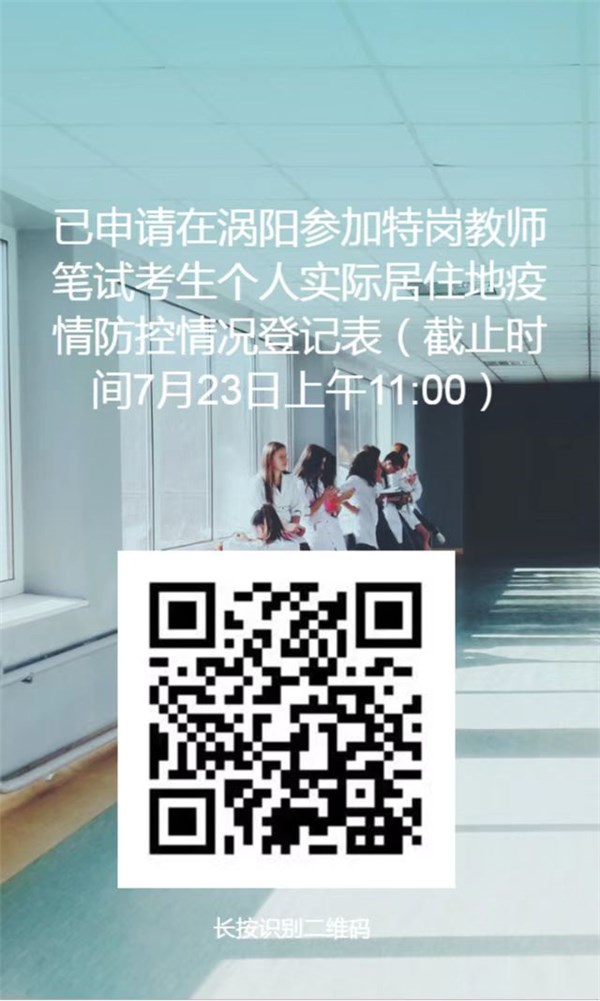 鉴于涡阳县突发疫情,根据省市教育主管部门安排,经研究,2022年7月24日举行的安徽省2022年农村特岗教师招聘笔试将在涡阳县设置考点。参加安徽省2022年农村特岗教师招聘笔试已打印准考证且目前居住或滞留在涡阳县的考生可自愿申请在涡阳县考点参加笔试。以下考生按照《关于在涡阳县设置安徽省2022年农村特岗教师招聘笔试考点的公告》要求提出了申请,现予以公示(见附件2)。请各位考生认真核对个人信息,如有信息错误,请及时与涡阳县教育局招生考试中心联系,我们将根据各位考生报考的岗位和当前实际情况排定考点(具体考点和考试要求另行通知)。同时为精准做好疫情防控工作,请公示的考生扫描二维码(见附件1),认真填写《已申请在涡阳参加特岗教师笔试考生个人实际居住地疫情防控情况登记表》,登记个人实际居住地疫情防控情况。信息核对及实际居住地疫情防控情况登记截止时间为7月23日上午11:00,逾期视为自动放弃。联系电话:0558-7213028。
