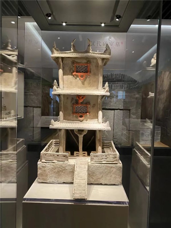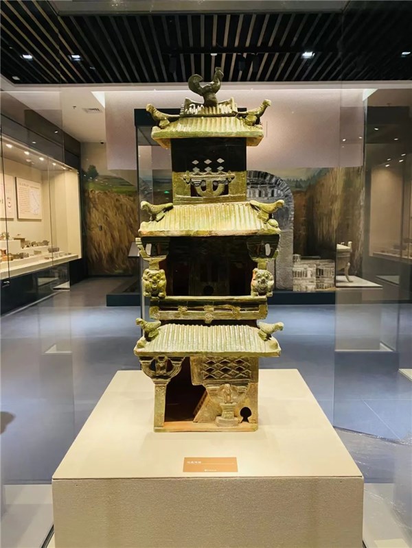 明器。陶质,共3层。顶层为单檐庑殿式屋顶,正脊、垂脊均饰吻兽。底层2开间,中间有立柱,4角设明柱,4周有回廊,外设卧棂栏杆。2层和3层正面均设有可以开启的棂花格窗,四周无门。整坐楼房,坐落在高15厘米的台基上,台基左侧有楼梯,正面有拱形门,门前有活动楼梯。