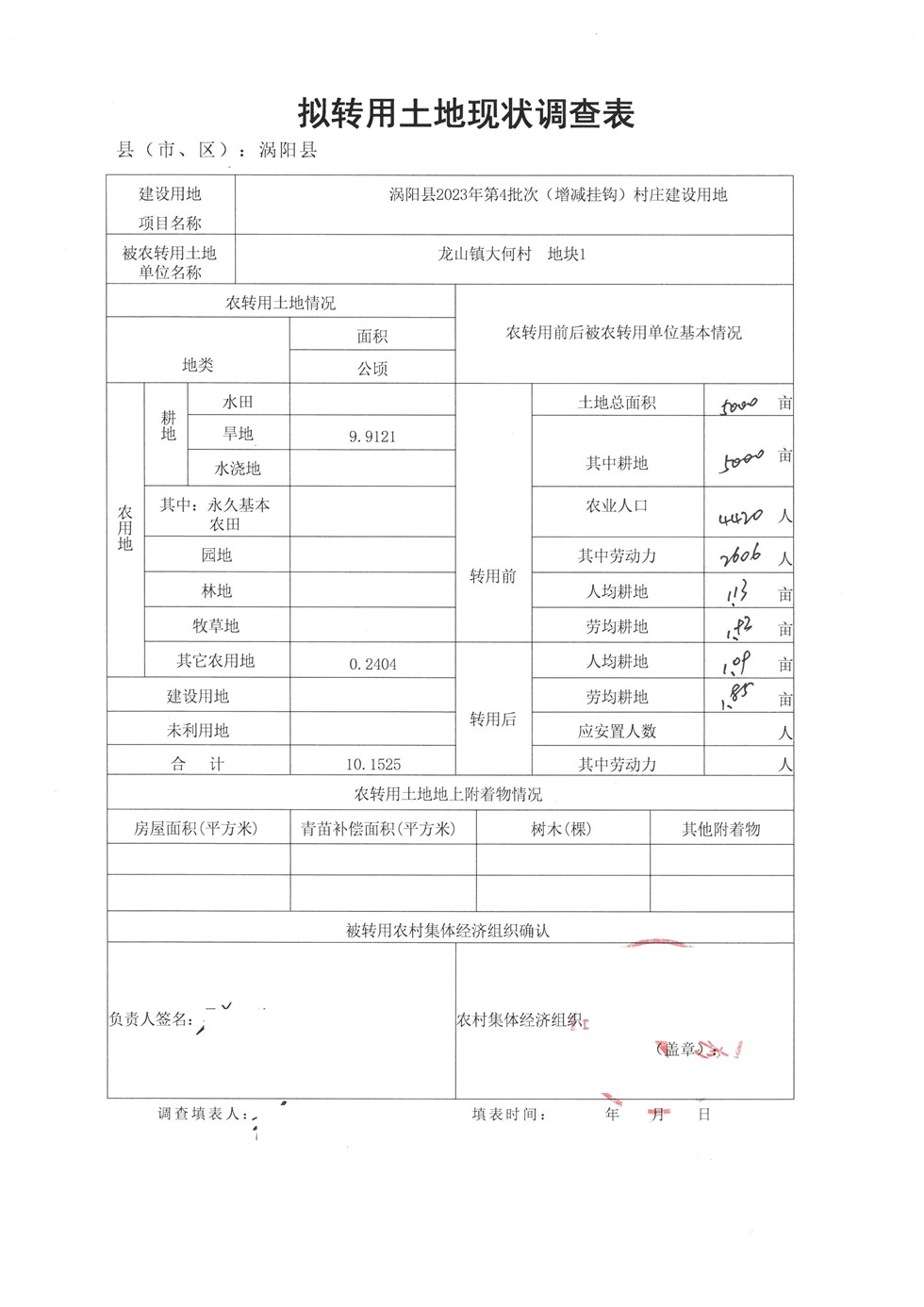 拟转用土地现状调查表(涡阳县2023年第4批次(增减挂钩)村庄建设用地)