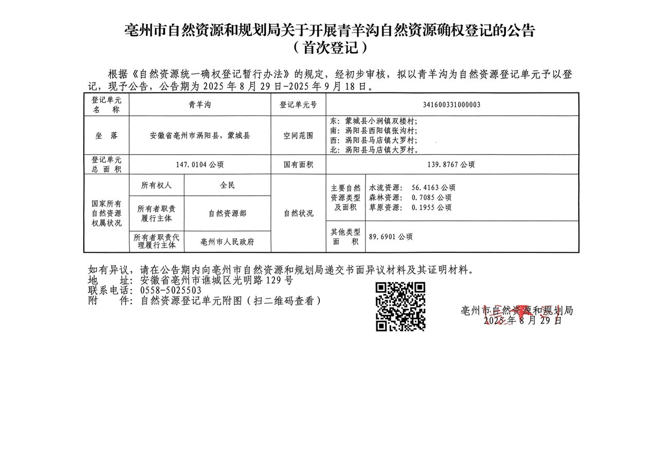 亳州市自然资源和规划局关于开展青羊沟自然资源确权登记的公告(首次登记)