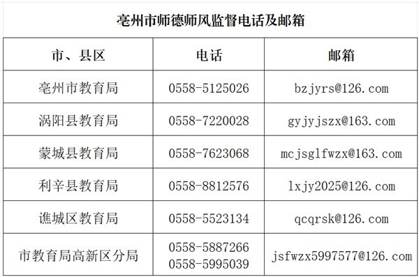 为进一步加强我市师德师风建设,方便群众参与监督,现将师德师风监督电话和邮箱公告如下,欢迎社会各界、广大群众进行监督。