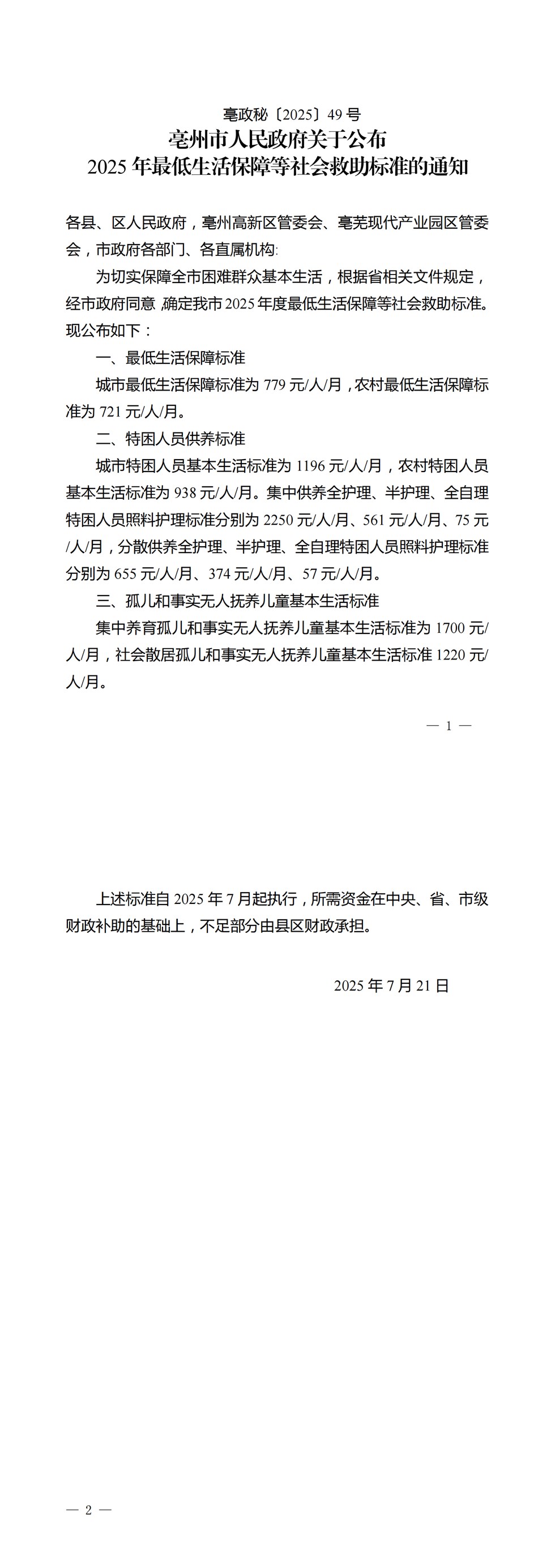 | 名称: | 亳州市人民政府关于公布2025年最低生活保障等社会救助标准的通知 | 文号: | 无 |