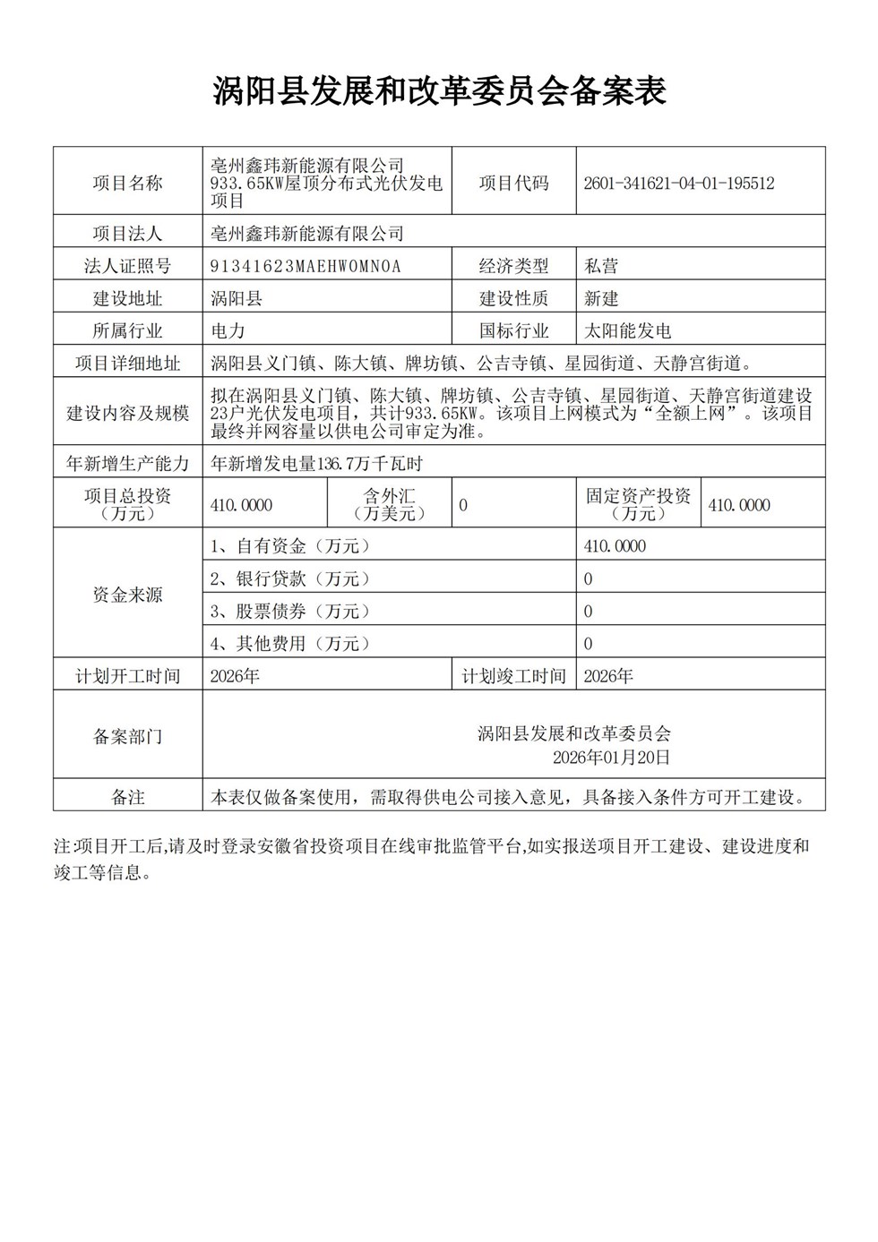 涡阳县发改委关于亳州鑫玮新能源有限公司933.65KW屋顶分布式光伏发电项目备案