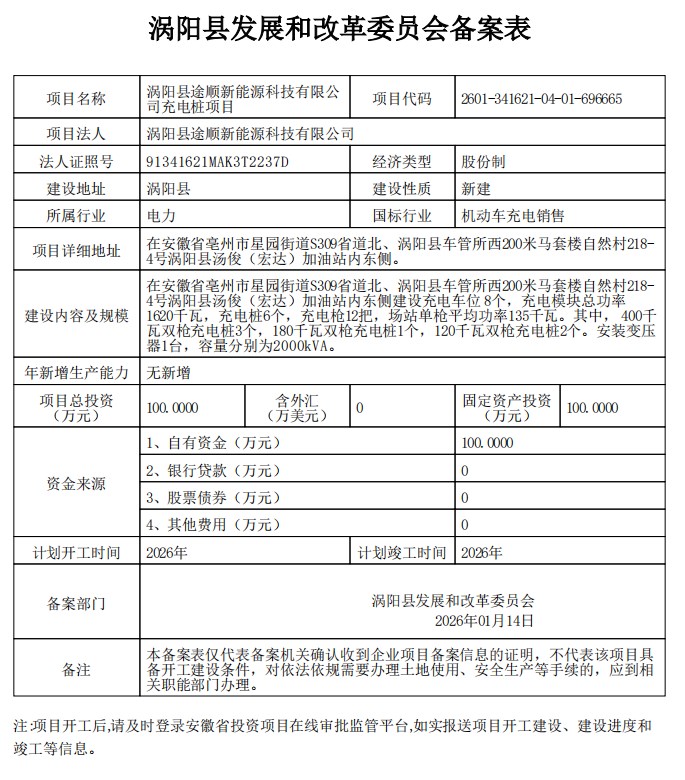 涡阳县发改委关于涡阳县途顺新能源科技有限公司充电桩项目备案