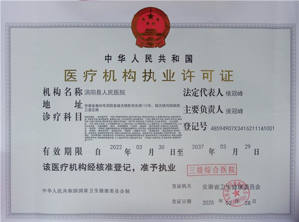 | 名称: | 涡阳县人民医院医疗机构执业许可证信息 | 文号: | 无 |