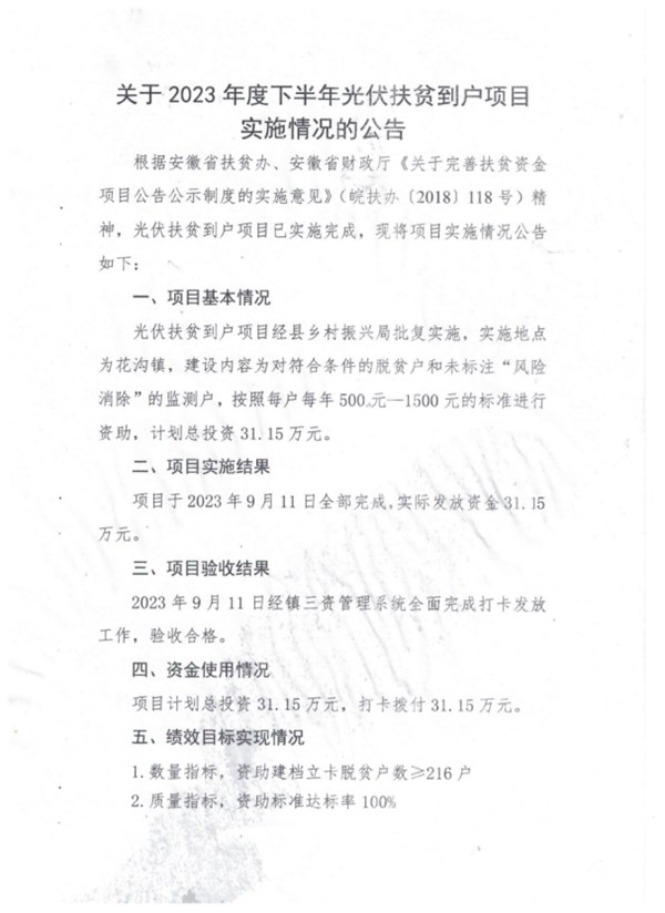 | 名称: | 花沟镇2023年下半年光伏扶贫到户项目实施情况公告 |