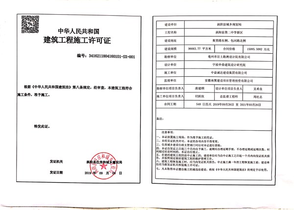 | 名称: | 涡阳县第二中学新区项目建筑工程施工许可证 |