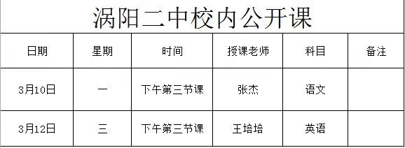 | 名称: | 涡阳二中校内公开课安排 | 文号: | 无 |