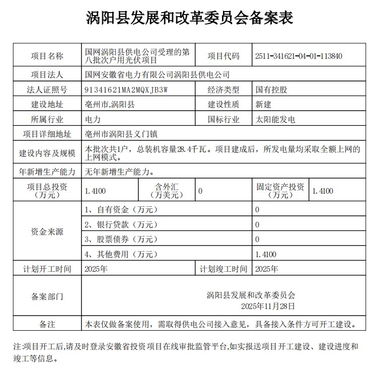| 名称: | 涡阳县发改委关于国网涡阳县供电公司受理的第八批次户用光伏项目备案 |