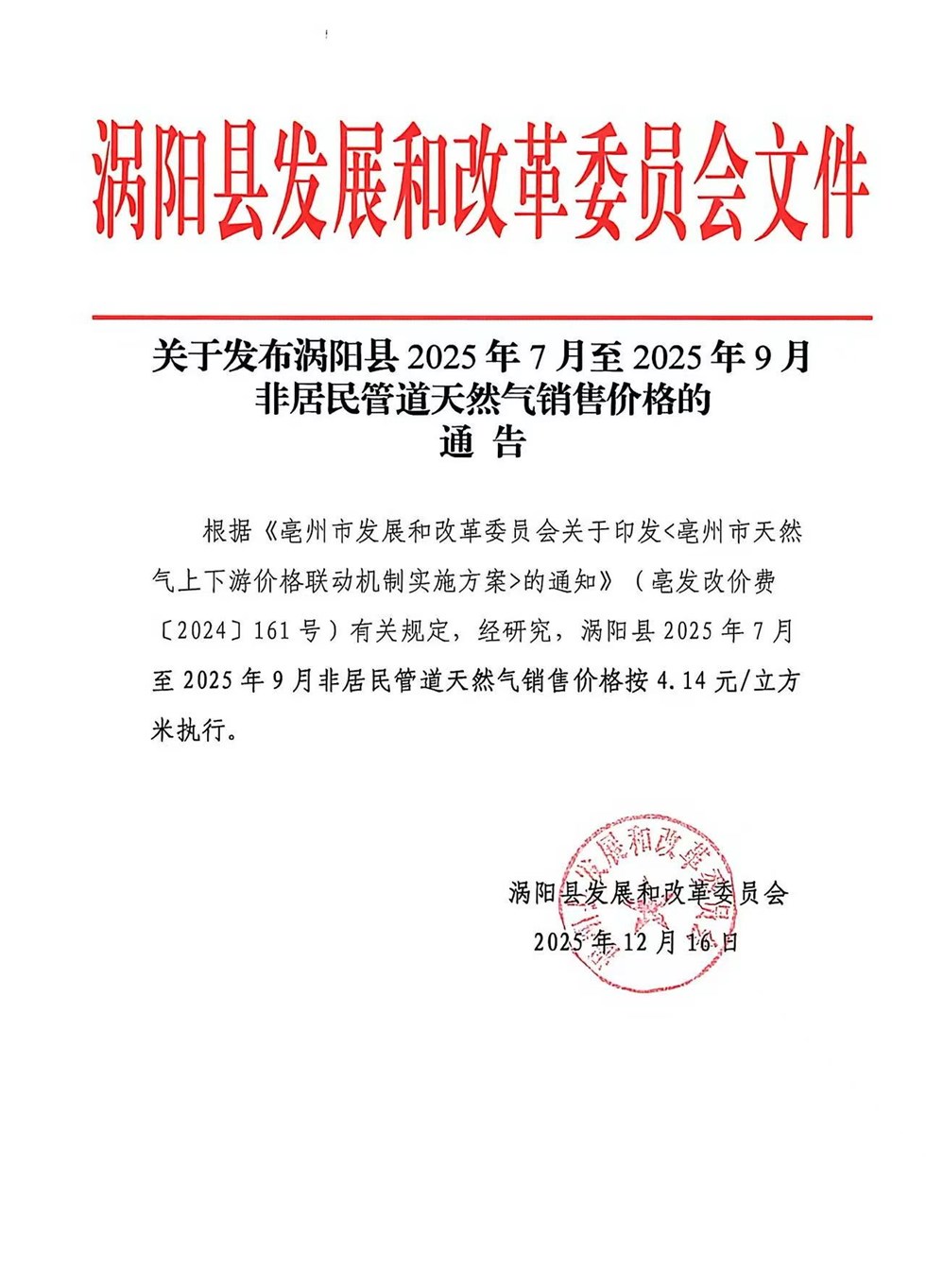 | 名称: | 关于涡阳海特燃气有限公司2025年7月至2025年9月天然气销售价格通告 |