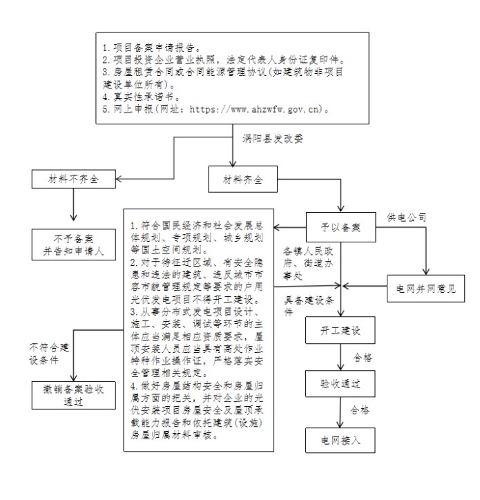 其他分布式光伏项目,项目业主自主选择投资开发企业后,由投资开发企业登录“安徽省投资项目在线审批监管平台”向县发改委申请备案,并提供项目基本信息、项目符合产业政策承诺书、产权证明(户用光伏用电户名与光伏新装屋顶户主身份证明一致的,无需提供)、租赁协议(合作开发协议)、营业执照复印件和法人身份证复印件等有关材料。